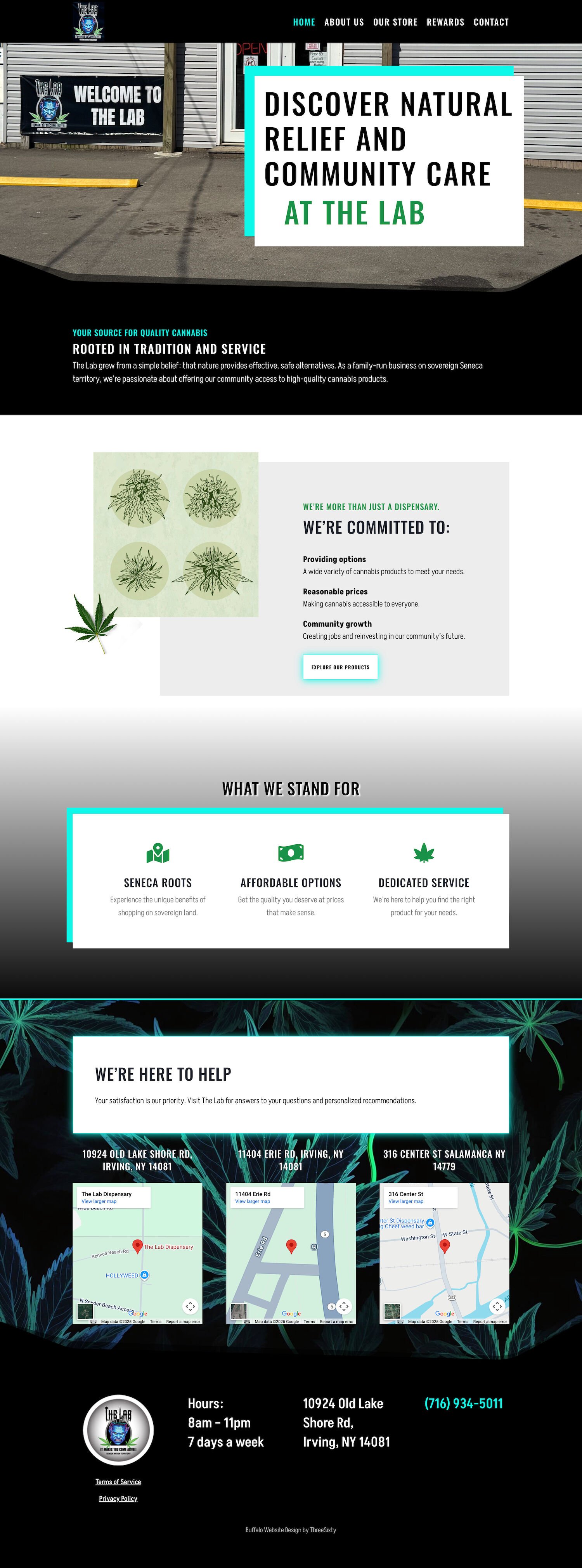 As a family-run business on sovereign Seneca territory, The Lab Dispensary is passionate about offering their community access to high-quality cannabis products. To promote their services and connect with the community online, The Lab Dispensary chose a fully responsive, themed Wordpress website custom designed by ThreeSixty. Visitors can learn more about the store, browse products, or reach out directly through a contact form.