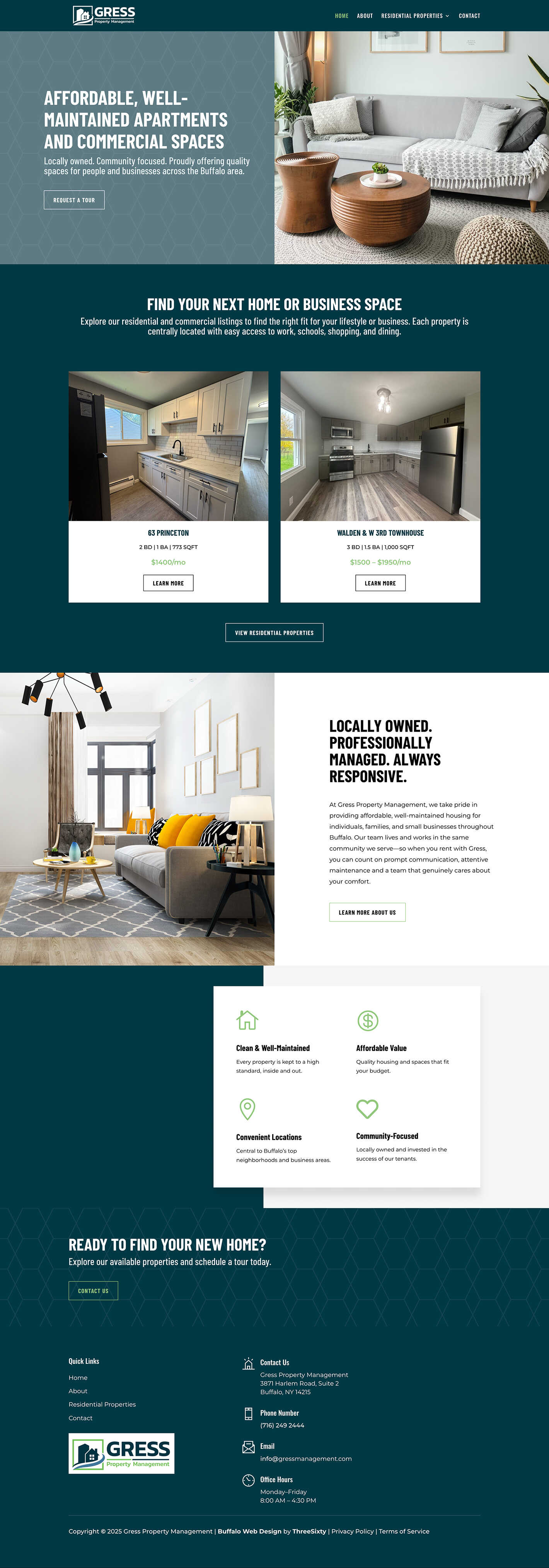 Gress Property Management brings their business online with a fully responsive wordpress website. New tenants can preview rental properties, schedule a tour, and reach out through an online contact form directly from the website.